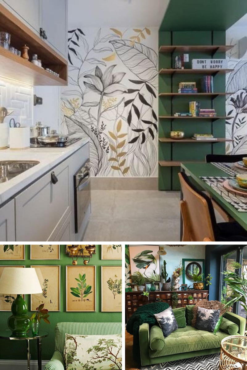 Сочетание натуральных текстур с изумрудной зеленью стен и растительным мотивом обивки мягкой мебели создадут эффект «полного погружения». В качестве декоративных элементов добавьте изображения любимых растений в стиле ботанической иллюстрации и наслаждайтесь круглый год ощущением прогулки по лесу.